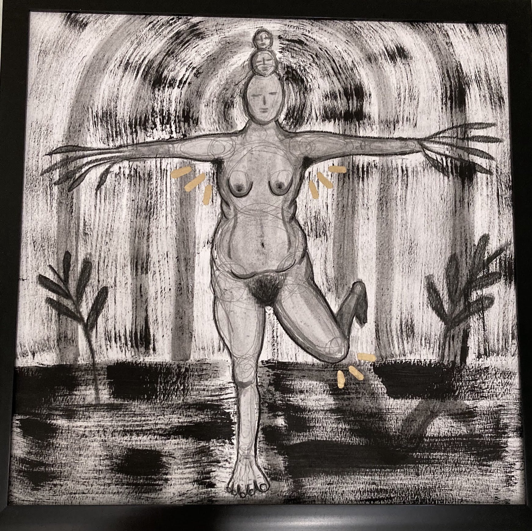 A figure stands against an abstract earth, firm, balanced, meditating. The figure begins to disappear as other body parts sharpen in focus. An embodiment of how release feels when practicing somatic healing. Graphite, acrylic, watercolor, and gold were dragged, blended, and dripped to create these original works.