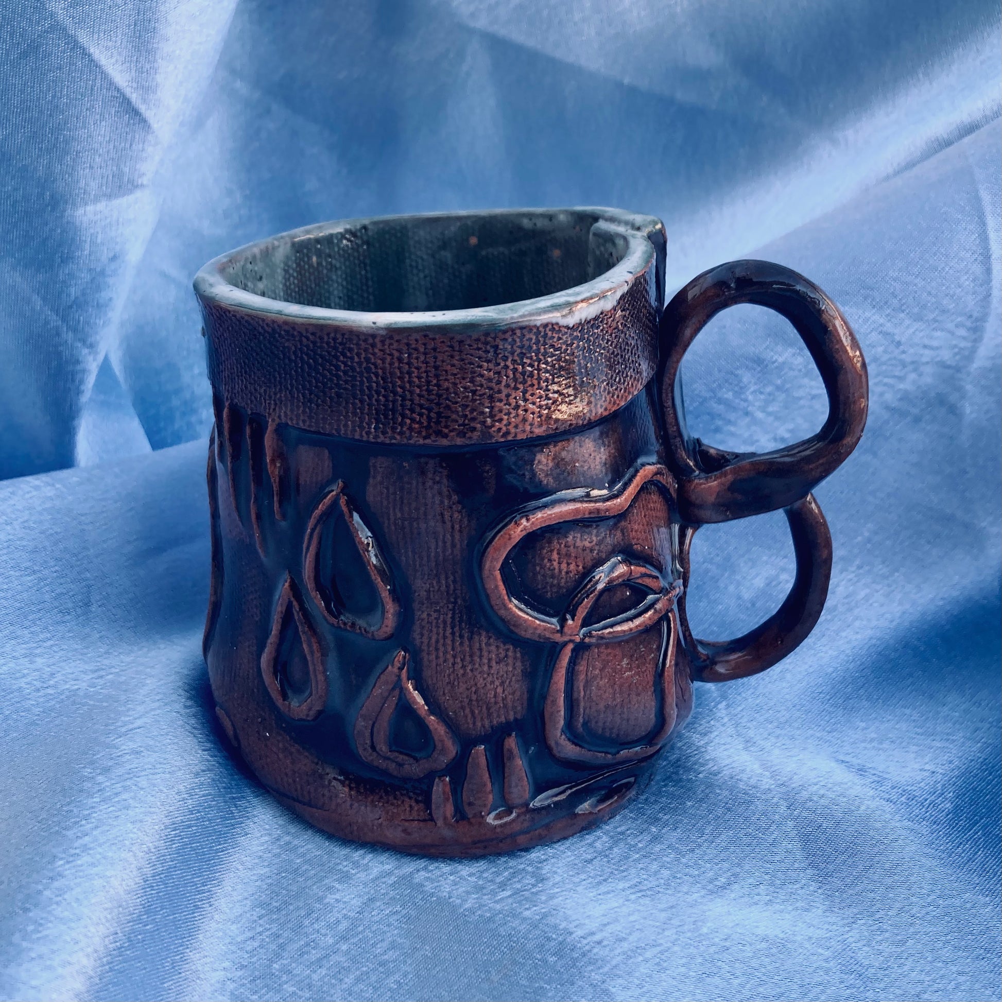 Stoneware mug with fun organic forms, lino block printed texture, and food safe glaze. Perfect for coffee, tea, and hydration!