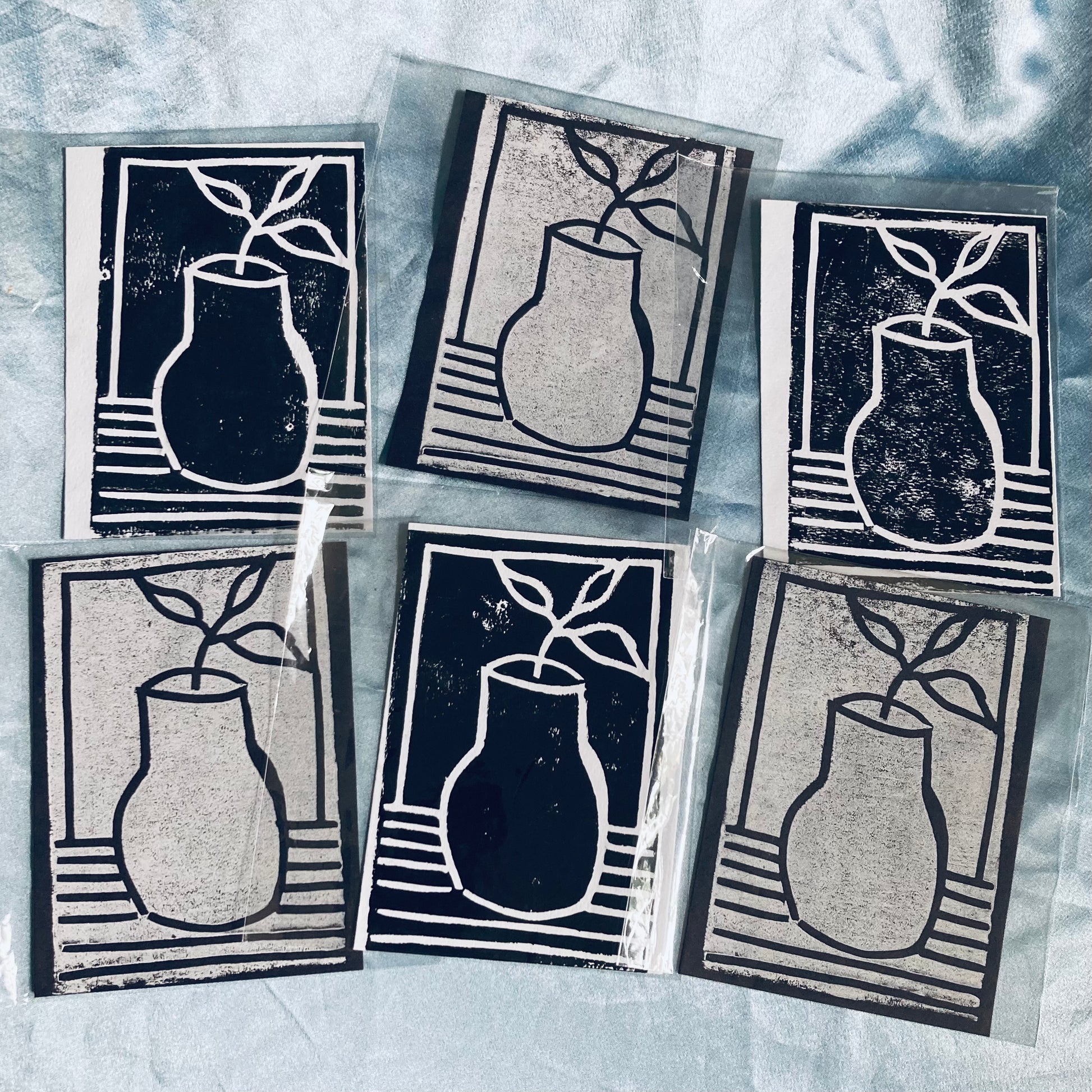 Each print is unique and hand printed with a linoleum block print I carved by hand.